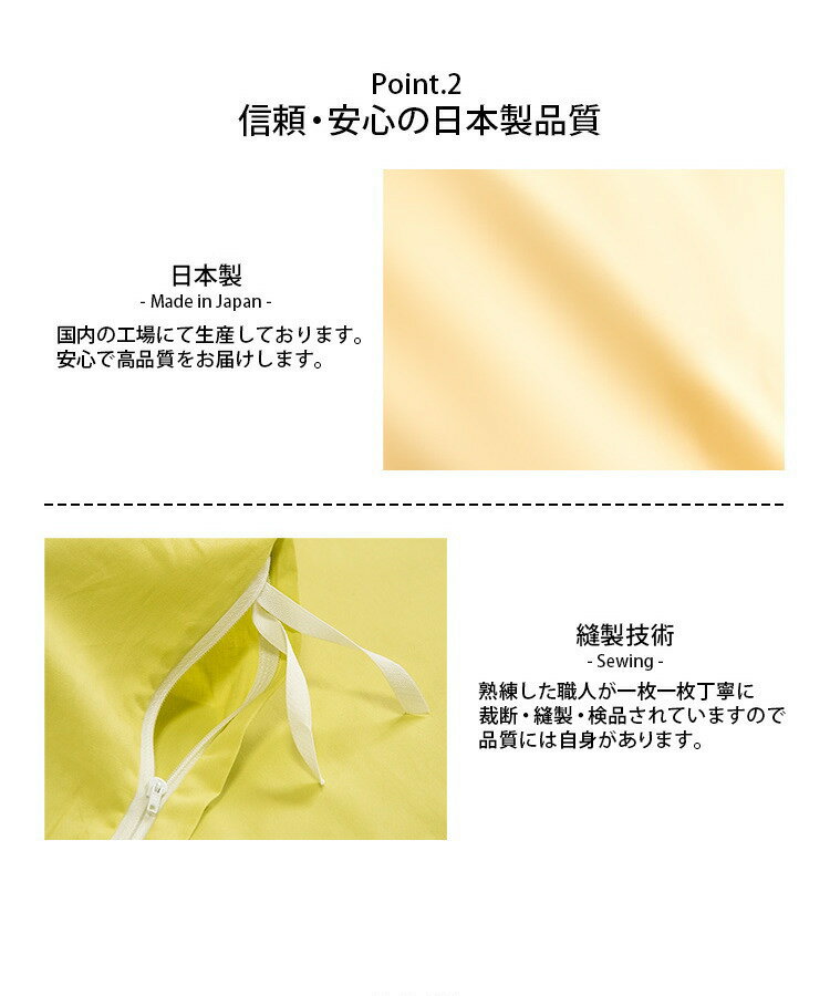 ベッド用3点セット シングル セミダブル ダブル 掛けカバー単品 シングル セミダブル ダブル ボックスシーツ単品 シングル セミダブル ダブル 枕カバー単品 43cm×63cm ▲上記サイズをクリックして、各ページをご覧いただけます Spec -商品詳細- 商品番号 sg/gs/100002 サイズ 掛けカバー:約170×210cm BOXシーツ:約120×200×25cm ピロケース:約43×63cm 組成 綿100% カラー ピンク・アイボリー・ブルー・ベージュ・グリーン・ブラウン・ネイビー・ブラック 仕様 掛けカバー:全開ファスナー式 (内ズレ防止ヒモ付き/8カ所) BOXシーツ:全周ゴム入り ピロケース:ファスナー式 生産国 日本製 洗濯表示 寸法変化率 タテ3% ヨコ3% ※洗濯時に若干色落ち・色移りする場合がございます。