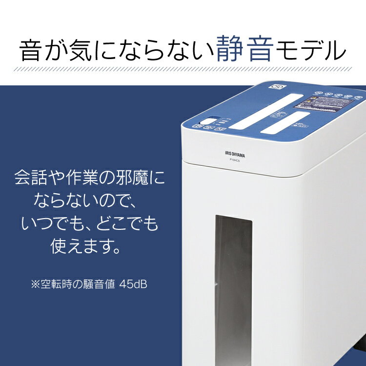 ●商品サイズ(cm)幅約23×奥行約36×高さ約49●商品質量約9.3kg●電源AC100V(50/60Hz)●定格消費電力50Hz:140W60Hz:150W●投入幅(mm)紙投入口:225CD・DVD投入口:122●細断サイズ(mm)紙:約3.9×32(クロスカット)●細断速度50Hz:約2.0m/分60Hz:約2.3m/分●定格使用時間10分●最大細断枚数A4コピー用紙(上質紙64g/平方メートル):10枚●定格細断枚数A4コピー用紙(上質紙64g/平方メートル):8枚CD、DVD、プラスチックカード:1枚●電源コード約1.6m●ダストボックス容量約17LA4コピー用紙:約180枚分●安全装置過熱保護のサーマルプロテクター、ダストボックススイッチ、逆転スイッチ(検索用:シュレッダー 裁断機 静音 セキュリティ 個人情報 機密情報 保護 細断 クロスカット 事務 書類 SOHO 家庭 オフィス A4 キャスター付 CD DVD メディア カード 4967576383844) 2018年10月24日リニューアルしました! 型番P8HM → P10HCS 最大細断枚数8枚 → 10枚