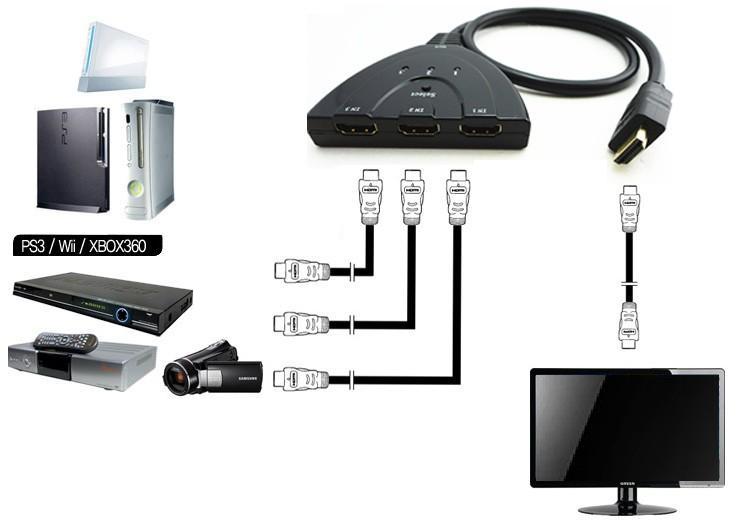 ノートパソコン、デスクトップ、ゲーム機などのHDMI出力もつ本体をHDMI 3口同時接続し、切り替えスイッチによりHDMI端子を持つモニター、液晶テレビ、プロジェクターへ映像出力行えます。