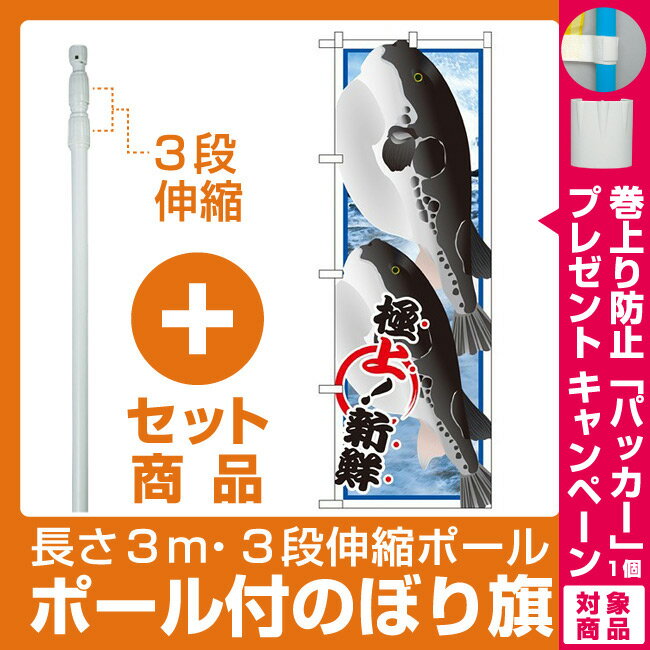【セット商品】3m・3段伸縮のぼりポール(竿)付 のぼり旗 ふぐ 水揚げ日本一 (SNB-2318)(寿司・海鮮/ふぐ料理)